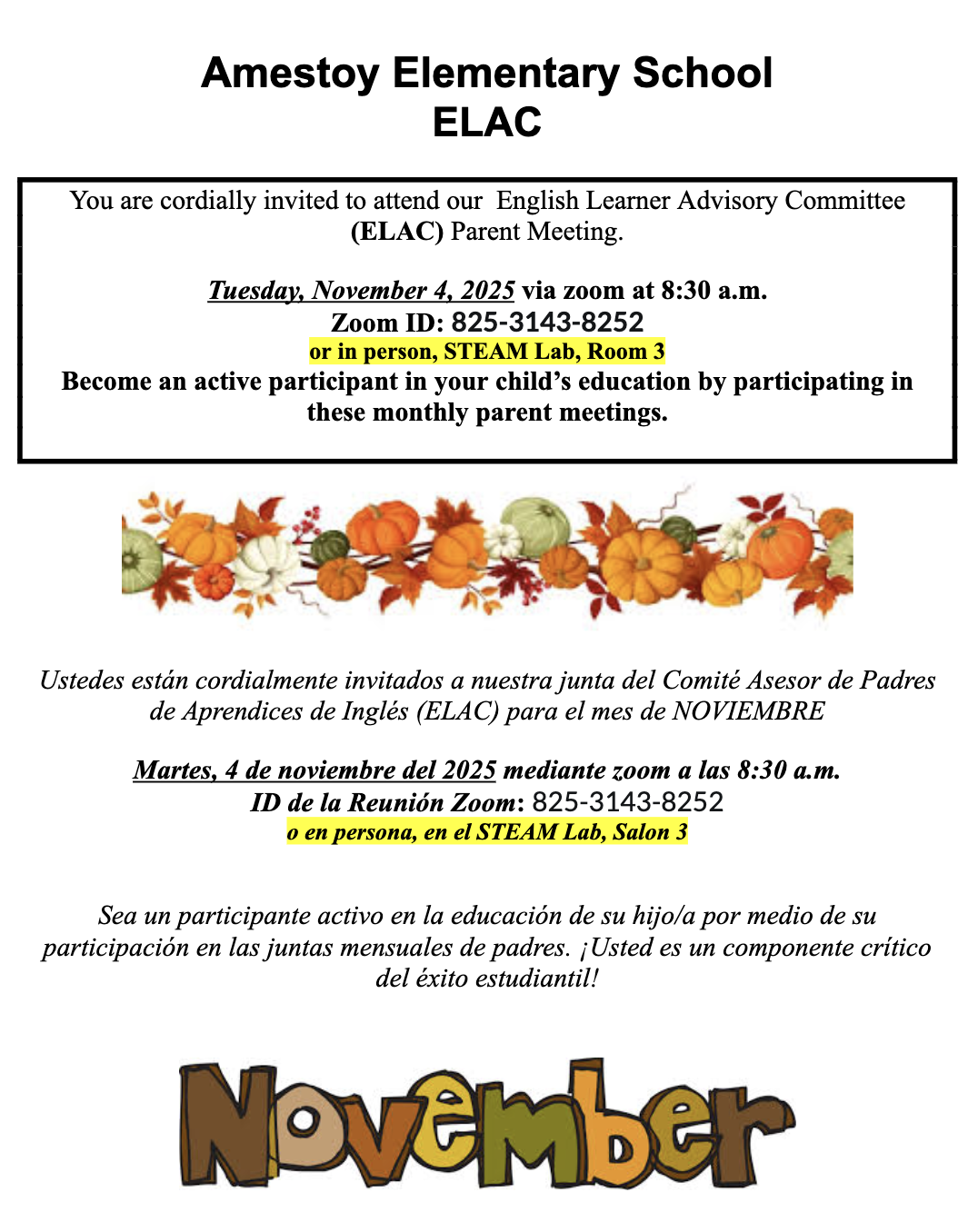 ELAC November Meeting, 11/4/25/ Junta de ELAC el 4 de Noviembre